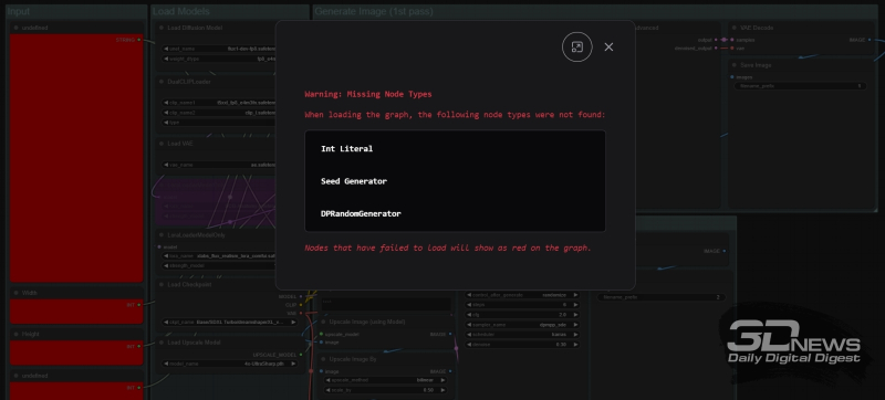 Na verdade, você não precisará inserir manualmente os nomes de todos esses nós na janela de pesquisa se baixar uma coleção de imagens do link fornecido próximo ao final deste “Workshop”, que começaremos a obter agora. Salvos no formato PNG com JSON integrado, esses arquivos, quando arrastados para o espaço de trabalho do ComfyUI, reproduzirão os ciclogramas incorporados neles. Se alguns dos nós do usuário não estiverem implantados no momento, os blocos retangulares correspondentes serão marcados em vermelho no ciclograma e o complemento do gerenciador emitirá um aviso correspondente. Abrindo então o menu do mesmo gerenciador e clicando no botão “Instalar nós personalizados ausentes”, não será difícil instalar sequencialmente todas as extensões necessárias. Também é recomendado – no mesmo menu – executar regularmente, pelo menos uma vez por semana, o comando “Atualizar tudo”: isso manterá atualizados o próprio ambiente de trabalho e todos os seus acréscimos.