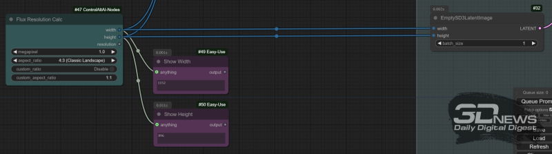 O nó “Flux Resolution Calc” do complemento ControlAltAI permite que você não pense no número exato de pixels em cada lado da tela selecionada: basta definir a proporção desses mesmos lados e a resolução geral da imagem em megapixels. Por sua vez, os nós “Mostrar Qualquer Coisa”, neste caso utilizados para controlar os valores exatos da largura e altura da tela, exibirão em suas janelas os valores calculados por esta “calculadora”
