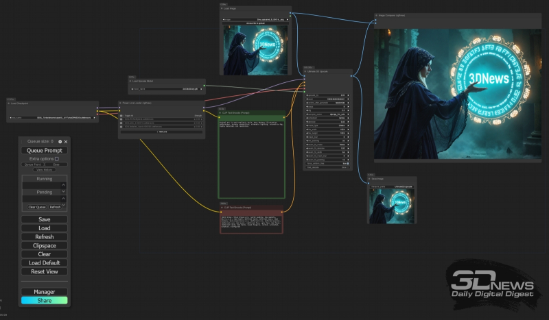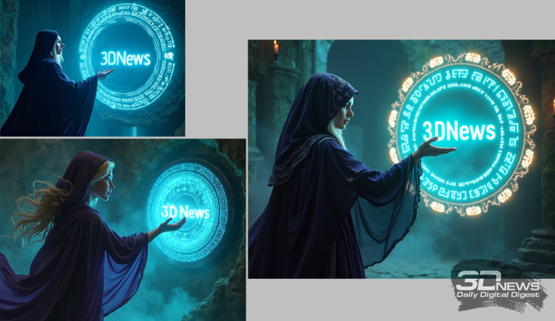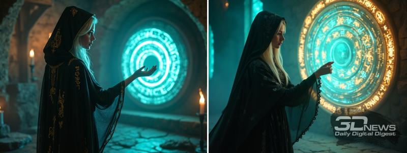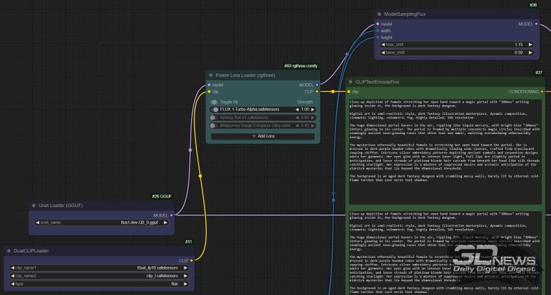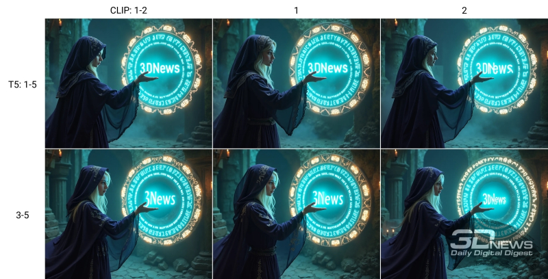 Conduzimos um experimento bastante simples: primeiro, deixando todos os cinco parágrafos do texto de dica preparado na janela inferior do nó “CLIPTextEncodeFlux”, inserimos os dois primeiros juntos, ou apenas o primeiro, ou apenas o segundo na janela superior ; então os dois primeiros parágrafos foram retirados da janela do T5, deixando apenas o terceiro ao quinto, e na janela do CLIP foi repetido o ciclo anterior – os dois primeiros parágrafos, só o primeiro, só o segundo. Os resultados são óbvios: a primeira opção é melhor que as outras em termos de composição e qualidade de detalhes (principalmente texto) – quando o modelo CLIP alimenta os dois primeiros parágrafos, delineando a construção geral e a solução artística da imagem pretendida, e para T5 estes parágrafos são duplicados, complementados por mais três com instruções mais detalhadas sobre como e o que deve ser representado. Com todas as outras combinações de parágrafos, ou a figura do misterioso estranho no portal sofre (o pescoço está excessivamente esticado), ou o texto, ou as misteriosas runas nos círculos mágicos, ou tudo isso junto.