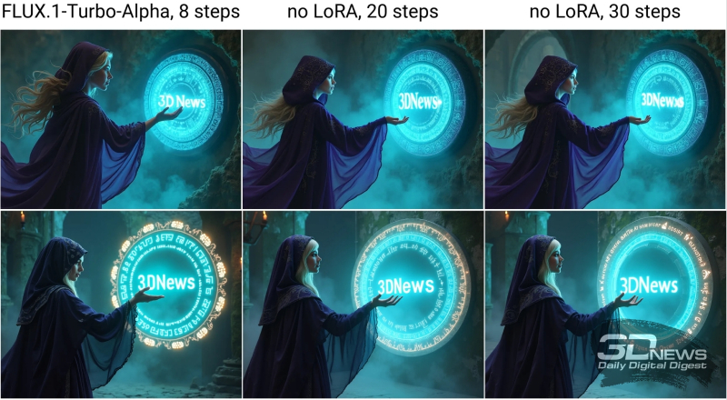 O exemplo acima mostra, em primeiro lugar, que para FLUX.1 [dev] realmente não há diferença fundamental entre as etapas de 20 e 30 gerações – além disso, pequenos detalhes significativos (mãos, runas brilhantes em um círculo mágico) provavelmente perderão qualidade à medida que o número de etapas aumenta o que eles compram. O acelerador FLUX.1-Turbo-Alpha.safetensors, por sua vez, torna ligeiramente mais grosseiros os pequenos detalhes e até trata os grandes (rosto, capuz, cabelo) com certa liberdade – mas ao mesmo tempo preserva a estética geral e a composição da imagem ( para cada resolução de tela selecionada) e, em geral, fornece um resultado bastante decente, especialmente em termos de reprodução de texto. A economia de tempo para cada geração é significativa: afinal, são 8 etapas de cerca de meio minuto cada (no caso de uma tela de 1 megapixel), e não 20, e principalmente não 30.