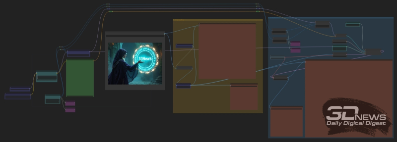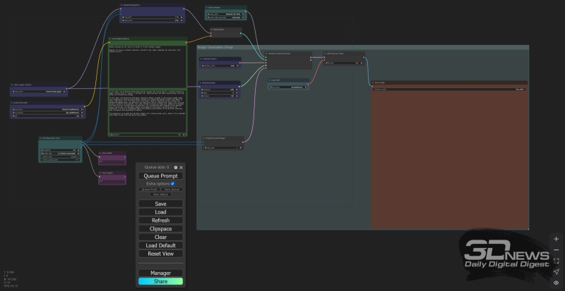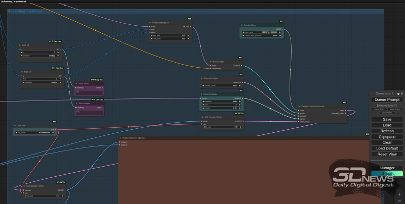 Na verdade, com esta exceção – que em vez da imagem latente diretamente de “EmptySD3LatentImage”, a entrada do nó principal do processador FLUX.1, “SampleCustomAdvanced”, é alimentada através de “VAE Encode (Tiled)”, uma imagem esticada por um externo upscaler destinado à ampliação – o “1º” bloco Img2Img Group” é quase completamente idêntico ao ciclograma original com o qual o considerado Temos apenas imagens com cinco parágrafos de texto como dica. Do ponto de vista prático, o nó “Image Comparer (rgtwo)” do add-on correspondente é interessante: permite, simplesmente movendo o mouse para a esquerda e para a direita, comparar visualmente duas imagens fornecidas às suas entradas. E, como você pode ver, a qualidade realmente melhora com essa ampliação.