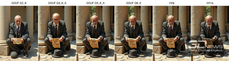 E agora – o mais importante: vejamos as velocidades. As variantes UNet/DiT utilizadas geraram imagens com resolução de cerca de 1 Mpix (832×1216 pixels) a uma taxa de aproximadamente 30 s por iteração para os três primeiros (Q_2_K, Q4_K_S, Q5_K_S) e cerca de 40 s/it. para os três restantes – Q8_0, FP8, FP16. Sim, em nossa máquina de teste (GTX 1070 8 GB + 24 GB DDR3) seria difícil esperar uma forte diferença de desempenho entre as variantes Q8_0 e FP16, mas sua ausência (praticamente; apenas dentro de algumas unidades do s/it. ) para Q_2_K e Q5_K_S , que diferem em volume quase pela metade, é muito mais impressionante. Provavelmente, a necessidade de movimentar muitos gigabytes de dados entre a memória de vídeo e a RAM lenta do sistema durante o carregamento sequencial dos primeiros modelos T5 e depois UNet anula a vantagem proporcionada pelo fato de que variantes com compactação mais séria cabem inteiramente na RAM de vídeo. De uma forma ou de outra, o sacrifício da qualidade da imagem ao usar Q_2_K em comparação até mesmo com Q4_K_S, sem falar em Q8_0, não parece muito justificado. Em outras palavras, é possível usar um modelo supercomprimido e mais rápido, mas não se deve esperar que mais tarde, tendo encontrado uma combinação bem-sucedida de uma dica e uma semente com sua ajuda, você obterá um resultado completamente semelhante na composição, só que com qualidade melhorada, ocupando um volume UNet maior. Isso significa que a prototipagem rápida apenas devido à compactação do modelo FLUX.1 [dev] principal não funcionará. Pelo menos com garantia.