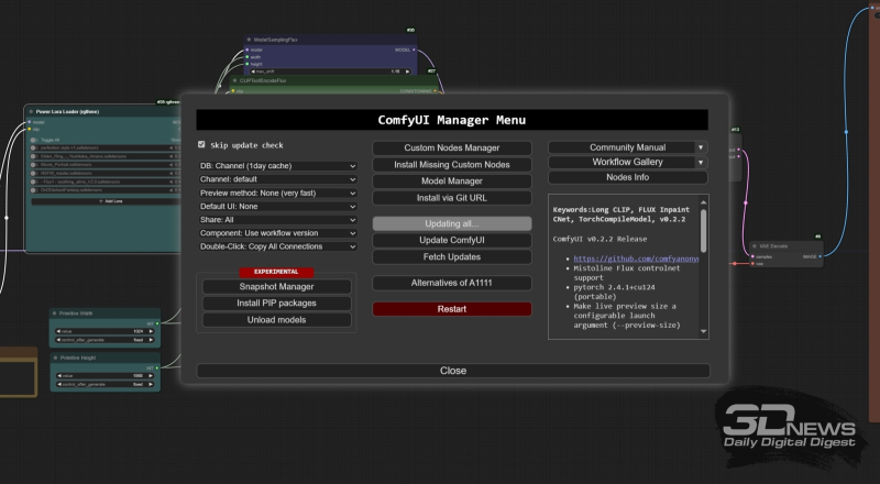 O menu do gerenciador de complementos ComfyUI (aliás, ele também se considera um complemento – com número de série 1, é claro) permite que você atualize de forma conveniente e rápida versões do próprio ambiente de trabalho e do complemento já instalado -ons