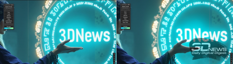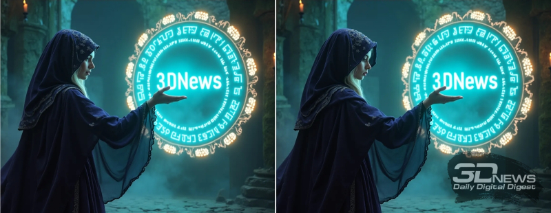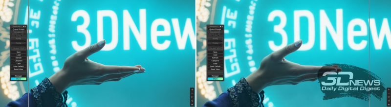 Uma demonstração visual do funcionamento do nó “Image Comparer (rgtwo)”: à esquerda – a linha vertical do controle deslizante é deslocada para a esquerda; o campo da imagem à direita dela, incluindo a mão e o portal mágico, corresponde ao resultado do dimensionamento com qualidade aumentada; à direita – o controle deslizante foi movido para o outro lado e agora é claramente visível que a imagem simplesmente ampliada usando “Upscale Image By” é claramente inferior em detalhes à final