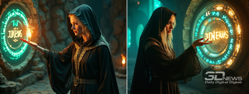 Contudo, seria ainda imprudente privar o CLIP da oportunidade de trabalhar no texto completo de forma independente, e não apenas com a ajuda do T5. No exemplo que damos, há uma diferença entre imagens com duplicação completa dos prompts de texto e com apenas os dois primeiros parágrafos restantes no campo CLIP. Sim, é quase imperceptível – manifesta-se apenas em detalhes sutis como a expressão facial da figura no portal, a elaboração do bordado em sua capa e a maior/menos semelhança do ornamento de âmbar na parte externa da magia. círculo com uma escrita alfabética misteriosa, e não apenas com padrões abstratos. Se você limitar o trabalho de gerar uma imagem adequada ao operador com resolução de 1 megapixel, pode não fazer sentido copiar o mesmo texto em ambas as janelas “CLIPTextEncodeFlux” – mesmo que a superior contenha apenas as instruções mais gerais para o Artista de IA e apenas o segundo contém uma dica completa. Mas tendo em conta que a imagem pode (e muitas vezes precisa ser!) ampliada, não só sem perder qualidade nos detalhes, mas com o seu aumento, é melhor ficar com a duplicação completa.