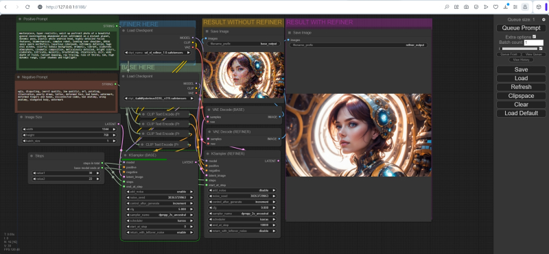 Longo ou curto, descobriu-se que o ComfyUI não tem esse tipo de problema: ele carrega os pontos de verificação SDXL corretamente, mesmo em hardware com 4 GB de RAM de vídeo, e funciona com eles sem travar devido a erros incompreensíveis e a velocidade de processando um e do mesmo prompt com outros parâmetros completamente idênticos, seu desempenho é significativamente superior ao do AUTOMATIC1111, quando ainda consegue forçá-lo a interagir adequadamente com o SDXL.