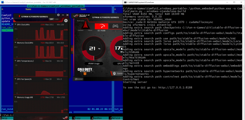 Felizes proprietários de uma GeForce RTX 3060 com 12 GB de RAM de vídeo relatam que a geração de uma imagem com resolução de 1024 × 1024 (padrão para o modelo XL – em oposição ao tamanho de 512 × 512 característico do SD 1.5) no AUTOMATIC1111 não apenas ocupa toda a memória de vídeo disponível, mas também e finalmente começa a trocar dados ativamente entre VRAM e RAM, retardando significativamente o processo. Ao mesmo tempo, o ComfyUI, para esgotar (mesmo que não completamente) os 12 GB de memória de vídeo disponíveis, precisa gerar simultaneamente, em lote, quatro imagens SDXL 1024 × 1024 – com os mesmos parâmetros de entrada, mas sementes diferentes .
