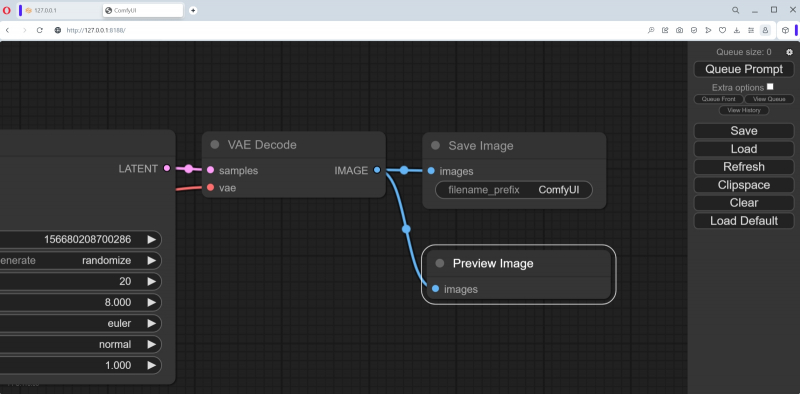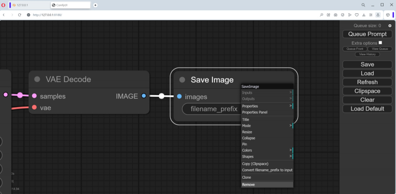 Neste caso, deixaremos os nós “Salvar imagem” e “Visualizar imagem” para mostrar que o ComfyUI pode operar com várias janelas de saída ao mesmo tempo. Mas se não for necessário “Salvar imagem”, não será difícil removê-la clicando com o botão direito sobre ela e selecionando a opção mais baixa do menu que se abre, “Remover”.
