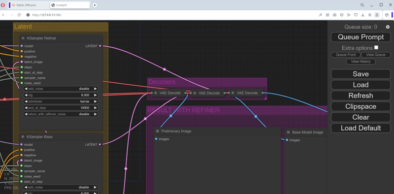 A próxima coluna contém três nós que especificam os parâmetros de entrada dos pontos de verificação SDXL: refinador KSampler, KSampler Base e KSampler preliminar. A partir deles, linhas rosa para emissão de imagens levam aos blocos de pós-processamento VAE correspondentes (na coluna da extrema direita), e abaixo deles há três janelas para as imagens finais. Mais precisamente, no primeiro aparecerá a imagem gerada pelo checkpoint preliminar, no segundo – pela base (que recebeu geração latente do modelo preliminar como um dos parâmetros de entrada), e no terceiro – pelo mais próximo (que , por sua vez, recebeu a imagem para processamento posterior do modelo base). Essencialmente, o KSampler Base é uma visualização (com remoção completa de ruído latente) da operação do submodelo SDXL principal,