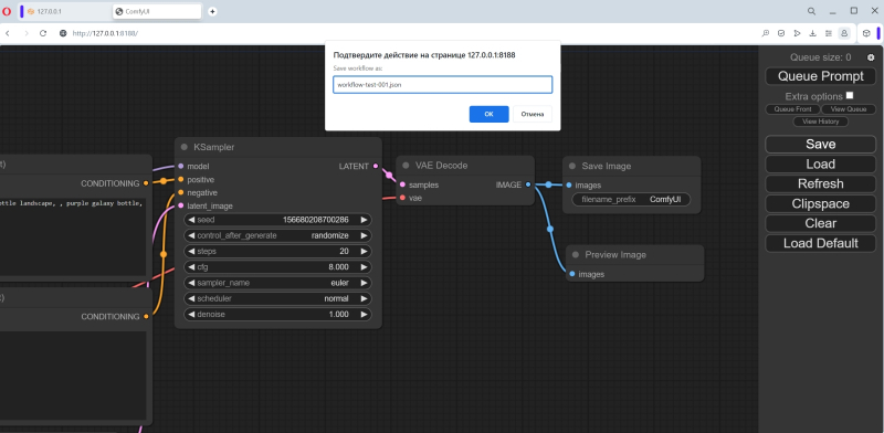 E por falar nisso, vamos aproveitar imediatamente o recurso mais conveniente do ComfyUI – salvar todo o fluxo de trabalho. Ao contrário do AUTOMATIC1111, aqui você não precisa verificar freneticamente todas as vezes, tentando reproduzir o resultado uma vez obtido, se CFG, Clip skip, o número de etapas de geração e outros valores estão indicados corretamente: aqui tudo pode ser salvo em um Arquivo JSON – antes mesmo da geração da primeira imagem no ciclograma construído. Ao clicar no botão Salvar no painel direito, o navegador informará que esta página está solicitando que você salve um arquivo, e nesta janela você poderá definir um nome para ele.