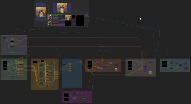 Assim, o próprio princípio de organização do ambiente de trabalho AUTOMATIC1111 é perfeitamente adequado para implementar uma ligação sequencial de dois submodelos com a transferência entre eles de uma imagem completamente isenta de ruído latente. O código deste ambiente (mais uma vez, façamos uma reserva, até a versão estável 1.5.1 atualmente em vigor) em princípio não implica a capacidade de produzir, mesmo como resultado intermediário, uma imagem com ruído latente residual. Mas no ComfyUI – que, de fato, pela ausência de interface, obriga o operador a construir pessoalmente ciclogramas para geração de imagens – para isso bastava escrever o nó apropriado. Ou seja, uma caixa preta (do ponto de vista do operador, claro, e não do programador que a criou), capaz de receber prompts de texto e outros parâmetros de geração como entrada, e produzir uma imagem como saída,