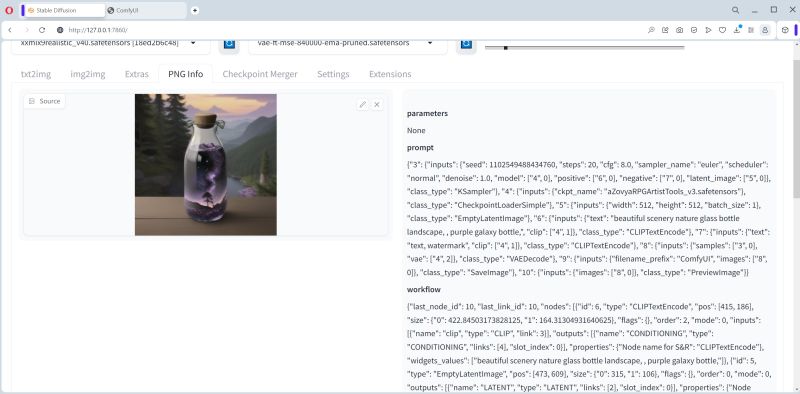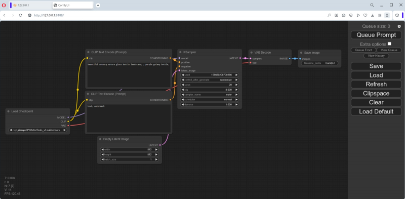 A dica de texto padrão descreve uma galáxia em uma garrafa – e, como podemos ver, a geração correspondente começou. Na interface web você pode acompanhar seu andamento: no canto superior direito, no topo do painel de controle, as gerações na fila estão em contagem regressiva; no topo do nó KSampler (denotando a mesma caixa preta com espaço latente dentro, cujas entradas são fornecidas com parâmetros especificados pelo usuário e a saída é uma imagem) uma faixa verde se move da esquerda para a direita.