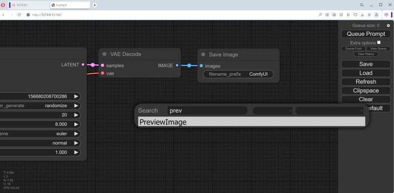 Para fazer isso, você precisa clicar duas vezes com o botão esquerdo do mouse em qualquer parte livre do campo de trabalho e, em seguida, selecionar a opção “PreviewImage” no menu que aparece (aqui está, a interface ComfyUI discreta – ainda está lá , embora de forma latente!).