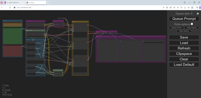 Mas o ComfyUI é muito diferente de todos os outros na forma como organiza o processo de geração de imagens a partir de texto. A questão é que neste ambiente de trabalho, o operador não apenas insere dados nos campos apropriados, marca caixas, pressiona botões e move controles deslizantes, mas constrói pessoalmente um procedimento sequencial de vários estágios (ciclograma) para converter texto em uma imagem por meio de imagens latentes. espaço, conectando os nós responsáveis pelas operações individuais (nós) são conexões lógicas através das quais determinados dados são transmitidos.