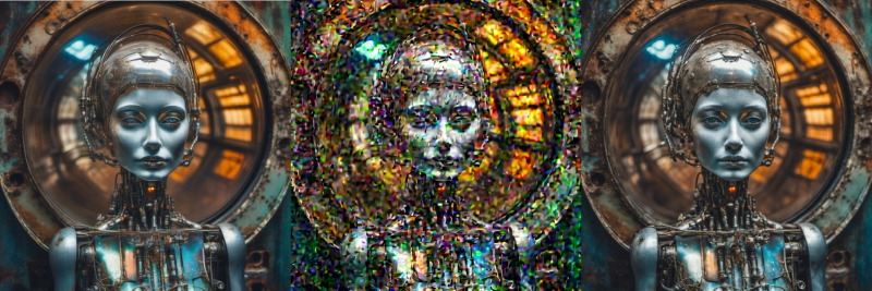 À esquerda está uma imagem completamente acabada (sem ruído residual) produzida pelo submodelo SDXL 1.0 básico em 20 etapas de geração; no centro – é o mesmo, mas com ruído latente residual antes de ser alimentado na entrada do mais próximo; à direita está o resultado final após 5 etapas de geração no modelo refinador (fonte: geração de IA baseada no modelo SDXL 1.0)