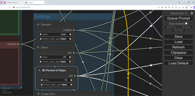 Abaixo, na mesma coluna, há um grande bloco “Configurações” com nós para diversas configurações, que deve ser muito familiar aos leitores de nossos materiais anteriores sobre geração de imagens usando o modelo SD 1.5 no ambiente de trabalho AUTOMATIC1111. Vamos tentar alinhá-los com aqueles com os quais o ComfyUI criou galáxias em uma garrafa durante seu primeiro lançamento.
