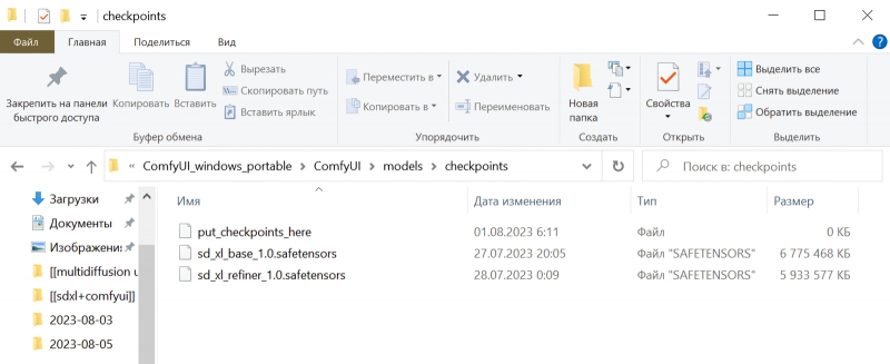 Assim como o AUTOMATIC1111, o ComfyUI é simplesmente um espaço de trabalho; Não contém modelos reais (pontos de verificação). Você precisará baixá-los (lembre-se, duas peças – uma base e uma mais próxima) na forma de arquivos .safetensors do repositório do desenvolvedor, Stability.ai, no site Hugging Face, usando os links apropriados: https://huggingface .co/stabilityai/stable-diffusion-xl -base-1.0 e https://huggingface.co/stabilityai/stable-diffusion-xl-refiner-1.0. No total, os arquivos ocupam cerca de 13 GB, então seja paciente.