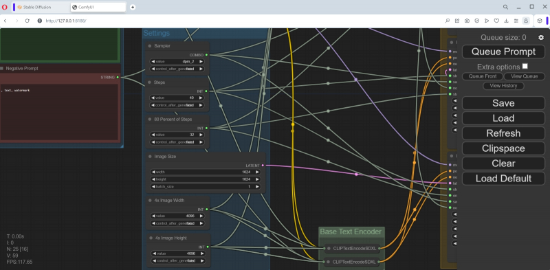 Vamos salvar o fluxo de trabalho modificado no arquivo workflow-test-002.json e iniciá-lo para execução clicando no botão “Queue Prompt”. Aqui você precisa ser paciente: a princípio nada parece acontecer, mas a carga da GPU sobe para 20-22% e as mensagens de serviço começam a ser executadas na janela de linha de comando onde o servidor SDXL 1.0 está sendo executado.