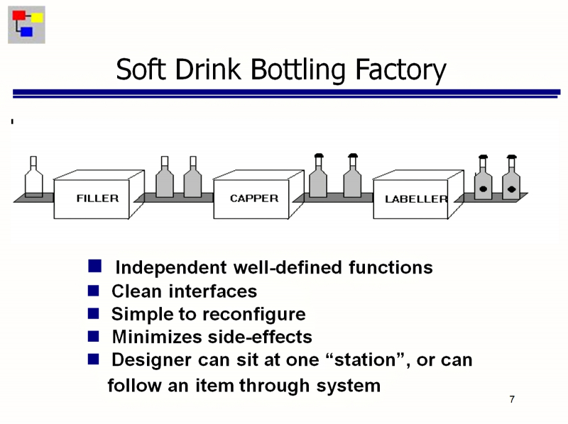 Uma explicação do princípio de funcionamento dos nós FBP como caixas pretas usando o exemplo de uma linha de embalagem em uma fábrica de refrigerantes: o gerente de processo não precisa saber exatamente como o enchimento, a tampa e a etiquetagem são implementados – ele só precisa conectar o necessário nós na ordem correta com uma esteira transportadora (fonte: GitHub)