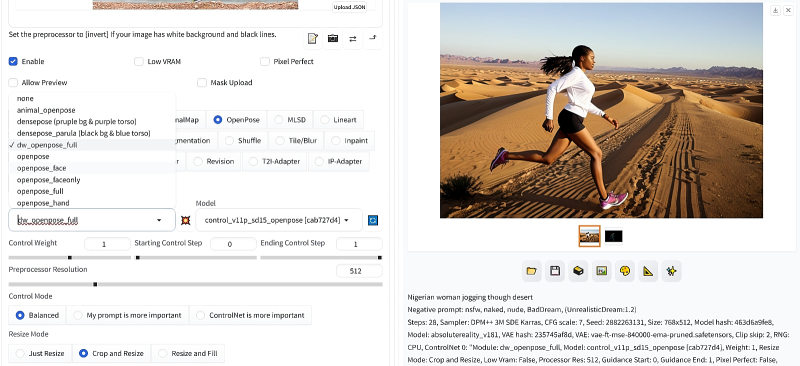 Agora ativamos o modo de controle OpenPose no menu suspenso ControlNet usando o botão de opção correspondente. Por padrão, o pré-processador openpose_full e o modelo control_v11p_sd15_openpose serão carregados nos menus suspensos de segundo nível logo abaixo. Você pode substituir o pré-processador padrão por um mais relevante, dw_openpose_full, – para tal imagem (uma pose bem articulada com membros bem espaçados, quase fundindo os dedos e um rosto pouco detalhado) não haverá muita diferença entre eles. Você não precisa tocar em mais nada – clique no botão “Gerar” e é isso que obtemos com a semente 2882263131 (à esquerda está uma foto de referência, no centro está o resultado do pré-processador, à direita está a imagem final):