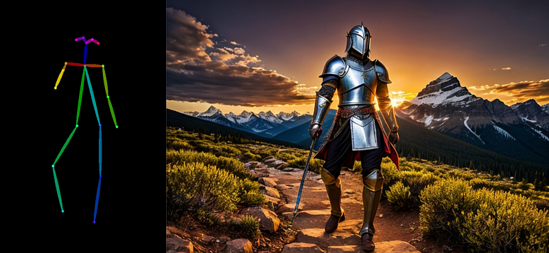 Os entusiastas da IA apreciaram essa flexibilidade do OpenPose – não é à toa que o já mencionado site Civitai tem muitas coleções de uma ampla variedade de poses. Aqui, por exemplo, está o Super Pose Book – uma coleção de três dúzias de arquivos PNG com “wire men” (além de exemplos de seu uso, que podem ser carregados na guia “PNG Info” da interface web do AUTOMATIC1111 para ver o texto dicas envolvidas em sua geração). E é isso que acontece, por exemplo, com a pose aberta (2), o alerta positivo e orgulhoso paladino de fantasia caminhando no caminho da montanha rochosa, o hipnotizante fundo do pôr do sol, a elaborada armadura brilhante, a foto premiada da Hasselblad e a semente 611118914: