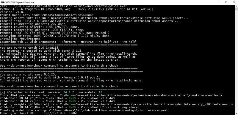 Após a conclusão da execução deste comando, o AUTOMATIC1111 será atualizado – e deverá ser iniciado da maneira usual, clicando duas vezes no arquivo webui-user.bat no Explorer. No momento em que este artigo foi escrito, a versão atual do ambiente de trabalho era 1.8.0 e esse número era exibido na parte superior da janela do servidor AUTOMATIC1111 que é aberta.