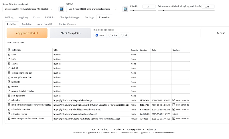 Tendo atualizado o próprio ambiente de trabalho, vamos perguntar se há alguma nova versão das extensões instaladas nele anteriormente (durante os seis episódios anteriores do “AI Drawing Workshop”). Para fazer isso, como antes, vá até a aba “Extensões” da interface web e clique no grande botão cinza “Verificar atualizações”. Se houver atualizações – isso é evidenciado pela marca “novas confirmações” na coluna “Atualizações” – você precisará clicar em “Aplicar e reiniciar UI”, após o que, para ter certeza, por precaução, reinicie também completamente o Servidor AUTOMATIC1111 (novamente com “Ctrl ” + “C” e a próxima execução de webui-user.bat).