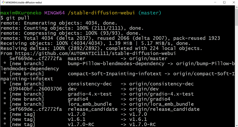 Qualquer software em desenvolvimento ativo recebe atualizações constantemente, e o ambiente de trabalho AUTOMATIC1111 não é exceção. No quinto episódio do AI Drawing Workshop, já mostramos como verificar novas versões – basta executar o comando git pull na janela do Git Bash aberta no diretório de instalação deste ambiente.