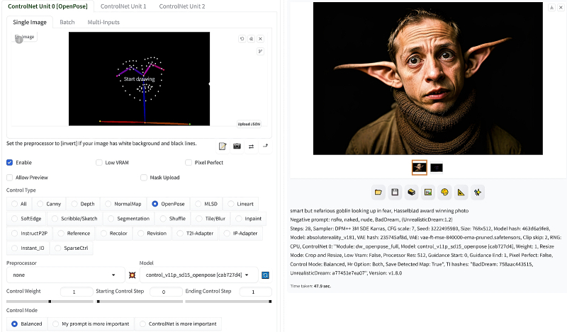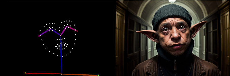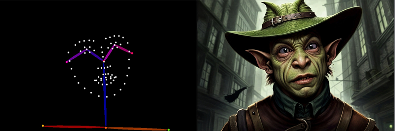 Como você pode ver, a última opção, que se baseia no trabalho de Estimativa Efetiva da Pose de Corpo Inteiro com Destilação em Dois Estágios, realmente mostra os resultados mais notáveis. E como o modo OpenPose depende apenas de pontos-chave do rosto e do corpo da imagem original, você pode fazer quase tudo usando o Stable Diffusion. Bem, digamos que esta dica positiva – um duende inteligente, mas nefasto, olhando para cima com medo – com todos os outros parâmetros em sua forma anterior dá o seguinte resultado: