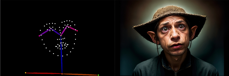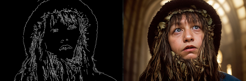 E agora vamos avaliar claramente suas próprias limitações – afinal, não apenas o OpenPose as possui. A detecção dos contornos dos objetos na imagem original ajuda a reproduzir detalhadamente até mesmo detalhes tão pequenos como a direção de visão. Mas também limita severamente a liberdade do modelo, que é solicitado a retratar algo muito diferente da fonte. Aqui você pode ver como o sistema tentou adicionar características de goblin ao rosto da garota, até mesmo retratando algo como uma barba espessa de capitão com folhas secas presas nela, mas a sensação geral do resultado é, para dizer o mínimo, desconfortável. Mas os olhos realmente olham para cima – o pré-processador Canny capturou esse detalhe perfeitamente no close-up do rosto.