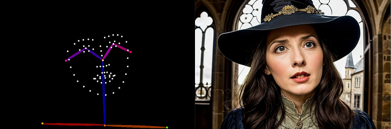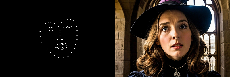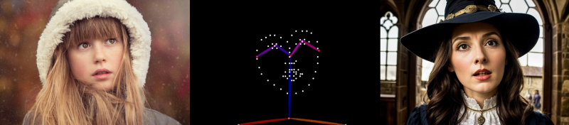 Em vez de uma garota nigeriana, pode haver qualquer personagem antropomórfico – um elfo negro, um autômato vitoriano, um predador – a pose permanecerá a mesma. Entre os pré-processadores disponíveis hoje, faz sentido escolher dw_openpose_full como uma encarnação posterior deste modo de controle ControlNet. Anteriormente, para gerações baseadas em retratos, onde o rosto e as mãos são mostrados em detalhes, o pré-processador openpose_face era frequentemente usado – aqui, por exemplo, ele transforma esta fonte (também uma foto disponível publicamente) de acordo com a dica positiva Medieval bruxa olhando maravilhada e com a negativa anterior: