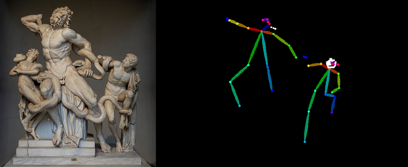 Infelizmente, o OpenPose nem sempre lida adequadamente com sua tarefa: no famoso grupo escultórico “Laocoonte e Seus Filhos”, o pré-processador openpose_full deste modo, por exemplo, se recusa categoricamente a reconhecer (com configurações padrão) a figura humana esquerda e desenhar “ fios” para ele (fonte: à esquerda – Wikimedia Commons, à direita – geração de IA baseada no modelo SD 1.5)