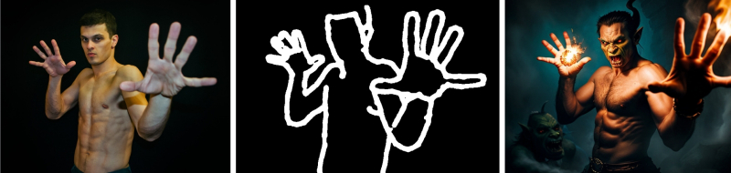 O pré-processador scribble_pidinet, o modelo control_v11p_sd15_scribble e a opção “ControlNet é mais importante” estão envolvidos aqui. A escolha do Scribble/Sketch neste caso se deve ao fato do modelo OpenPose, curiosamente, ter grande dificuldade em reproduzir os dedos na imagem resultante – embora o pré-processador os detecte de forma bastante adequada. Talvez o fato seja que o esquema de codificação de cores dos fragmentos do corpo do OpenPose seja imperfeito – em particular, não contém tons claramente distinguíveis para diferentes dedos.