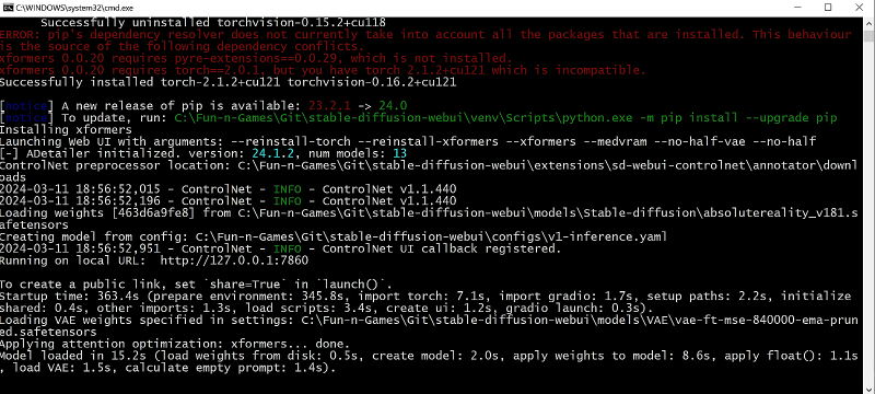 Definir COMMANDLINE_ARGS=–reinstall-torch –reinstall-xformers –xformers –medvram –no-half-vae –no-half