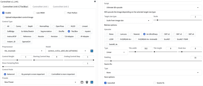Ativamos “Tiled VAE” no menu suspenso com os mesmos parâmetros da aba “txt2img”. A seguir, no menu suspenso ControlNet, selecione o modo “Tile/Blur” com o pré-processador tile_resample e o modelo control_v11f1e_sd15_tile (felizmente, é o único lá). A própria imagem transferida para “img2img” será a referência, mas se você precisar de outra (por que exatamente isso pode ser necessário, explicaremos mais tarde), a opção “Carregar imagem de controle independente” será útil. Agora você precisa abrir o menu suspenso “Script” localizado ainda mais abaixo e selecionar “Ultimate SD upscale”, para o qual especifique “Target size type” – Escala do tamanho da imagem, x2, “Upscaler” – 4x-UltraSharp, e você não precisa tocar em mais nada.