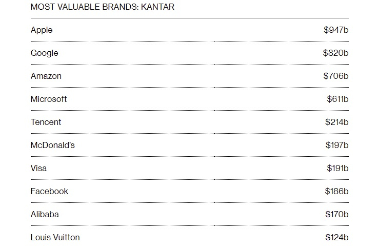 A Louis Vuitton, uma marca de moda de propriedade da francesa LVMH SE, chegou ao top 10 das marcas mais valiosas do mundo pela primeira vez. Com um valor estimado de US$ 124,2 bilhões, está localizado em 10º lugar no ranking. Nos últimos anos, o valor da marca aumentou 64%.
