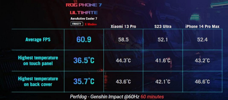 O ROG Phone 7 Ultimate possui um conector AeroActive Portal dedicado que permite a conexão direta a um sistema de resfriamento externo AeroActive 7 com um ventilador para melhor evacuação do corpo. Além disso, há uma tela ROG Vision no painel traseiro. Em geral, o sistema de refrigeração de ambos os modelos GameCool7 ficou melhor e maior em relação às gerações anteriores, com uma camada adicional de nitreto de boro e painéis de grafite com área total de 16 mil mm2, devido ao qual a eficiência térmica aumentou em 10 %. Há também uma câmara de vapor de ciclo rápido avançada e um aumento adicional de eficiência de 15%, graças ao uso do chipset Snapdragon 8 Gen 2.