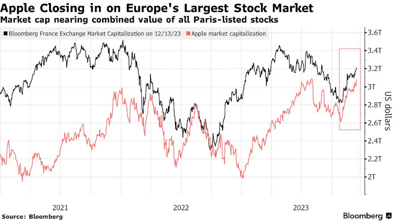 Um índice compilado pela Bloomberg que mostra uma comparação entre a capitalização de mercado da Apple e o mercado de ações francês (Fonte da imagem: Bloomberg)