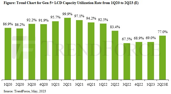 O recente início do crescimento na demanda por painéis de TV, juntamente com o aumento dos preços, levou os fabricantes a aumentar a carga da linha de LCD da geração 5+ para 77% no segundo trimestre de 2023. No entanto, de acordo com um estudo recente da TrendForce, assim que a LG Display cortar e/ou interromper a produção de LCD em suas linhas P6, P7 e Guangzhou, a proporção geral será significativamente menor do que no mesmo período do ano passado.