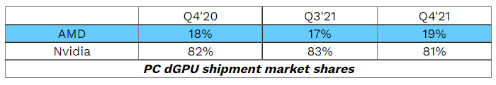 As vendas globais de GPUs para PC atingiram 101 milhões de unidades no quarto trimestre de 2021, das quais pouco mais de 13 milhões eram GPUs discretas e o restante eram GPUs integradas, segundo analistas da Jon Peddie Research. A AMD conseguiu aumentar as vendas e a participação de mercado, enquanto a NVIDIA, ao contrário, sofreu um declínio.