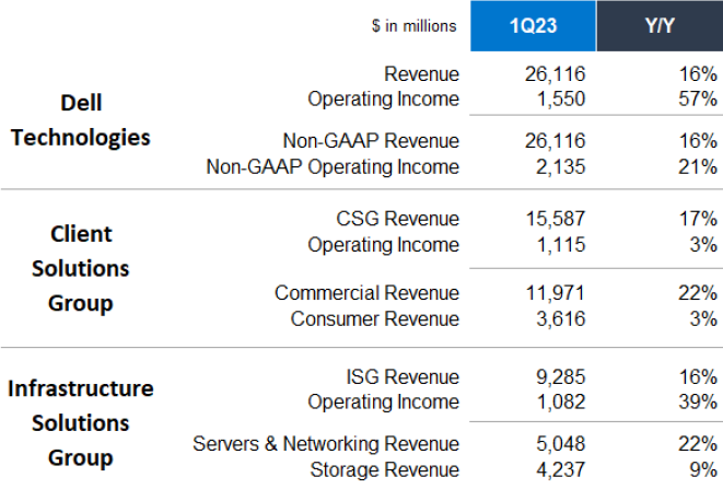 O lucro operacional da empresa como um todo cresceu 57% para US$ 1,55 bilhão, atualizando o recorde histórico. Somente no primeiro trimestre, a Dell conseguiu aumentar sua participação no mercado de PCs em 1,9 ponto percentual, o ganho mais forte entre os quatro principais fabricantes. No segmento de servidores, o financeiro cresceu pelo sexto trimestre consecutivo, também impulsionado pela demanda de clientes corporativos.