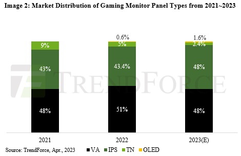 Analistas disseram que os LCDs VA representaram a maior parte do mercado em 51% em 2022, seguidos pelos LCDs IPS em 43,4%, e os TNs legados agora respondem por cerca de 5% das remessas. Vale ressaltar que os monitores OLED estavam ganhando popularidade, embora sua participação ainda fosse de apenas 0,6%. A participação de mercado de OLED deve aumentar para 1,6% em 2023. Além disso, a participação da tecnologia IPS pode aumentar devido aos preços mais baixos dos produtos relacionados.