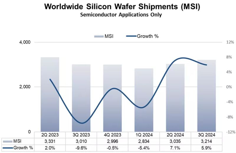 De acordo com a associação SEMI, no terceiro trimestre, as remessas sequenciais de wafers de silício aumentaram 5,9%, para 3,2 bilhões de polegadas quadradas, um aumento anual de 6,8%. As remessas têm aumentado consistentemente desde o segundo trimestre deste ano, sugerindo uma recuperação na procura de componentes semicondutores.