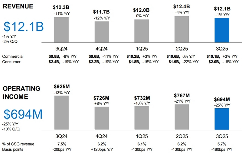 Por sua vez, a Dell notou uma boa procura pelos seus sistemas de servidores devido ao desenvolvimento da inteligência artificial, mas no segmento de PCs enfrenta elevada concorrência e incerteza dos consumidores quanto ao futuro, o que os obriga a limitar as compras. O segmento de negócios de PCs da Dell apresenta os melhores resultados no segmento corporativo, enquanto no segmento de consumo a receita é pior do que o esperado (US$ 12,13 bilhões contra US$ 12,43 bilhões). Mas o número de pedidos de soluções de servidores para IA no final dos trimestres aumentou 50% e, em termos monetários, atingiu US$ 3,6 bilhões. A receita na direção de soluções de infraestrutura como um todo aumentou 34%, para US$ 11,37 bilhões, o que foi maior. do que o esperado. A empresa forneceu diretamente servidores de IA no valor de US$ 2,9 bilhões no último trimestre, valor inferior aos US$ 3,1 bilhões que recebeu no trimestre anterior.
