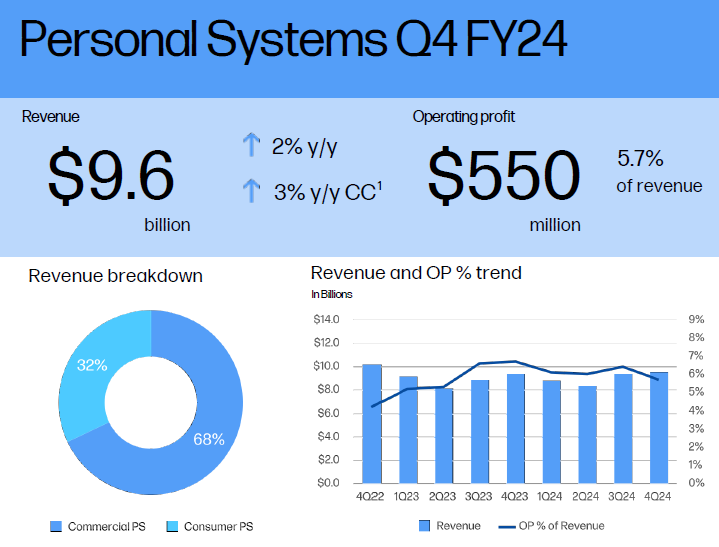 Somente os sistemas pessoais trouxeram a HP Inc. no último trimestre, receita de US$ 9,6 bilhões, 2% a mais que o resultado do mesmo período do ano passado, e em termos quantitativos, as entregas aumentaram 1%. Se no segmento comercial as remessas de PCs aumentaram 4% em relação ao ano anterior, no segmento de consumo diminuíram 3%. As receitas cresceram 5% no setor comercial e caíram 4% ano a ano no setor de consumo. Em geral, a receita no negócio de sistemas pessoais conseguiu crescer principalmente devido ao aumento da oferta no segmento comercial e ao aumento do preço médio de venda de PCs. O setor comercial forneceu 68% da receita das vendas de PCs, enquanto o setor de consumo foi responsável pelos 32% restantes. Segundo o presidente da empresa, Enrique Lores, o lançamento de uma nova versão do Windows nesta geração não estimula o crescimento da demanda por novos PCs como acontecia antes.