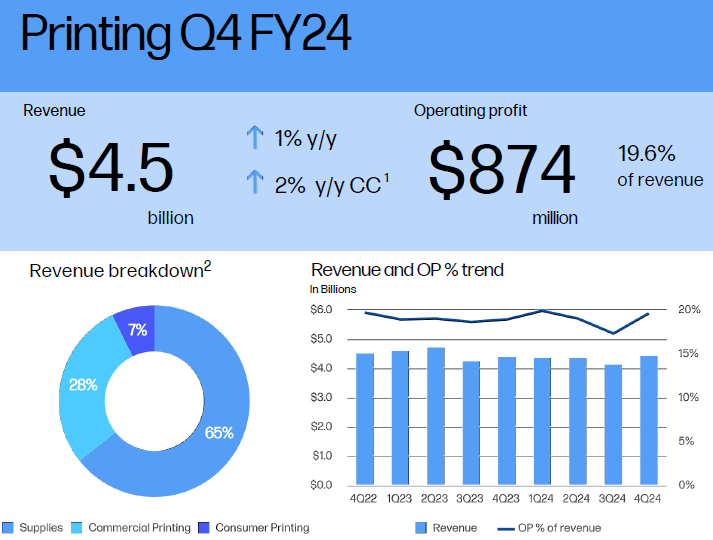 O segmento de equipamentos de impressão trouxe a HP Inc. com base nos resultados do último trimestre, a receita de US$ 4,5 bilhões cresceu 1% ano a ano e 2% sequencialmente. Deste montante, 65% foram provenientes de consumíveis, cujas receitas provenientes da venda aumentaram 2% face ao período homólogo. No segmento de dispositivos de impressão de documentos comerciais, a receita da empresa diminuiu 1% ano a ano, mas gerou 28% de toda a receita na área de impressão. Finalmente, as vendas de dispositivos de impressão de documentos no sector de consumo aumentaram as receitas em 3% ano após ano, mas representaram apenas 7% de todas as receitas de caixa nesta área. As entregas de dispositivos de impressão em todos os setores cresceram 10% em termos de volume no último trimestre.