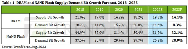 De acordo com a TrendForce, no próximo ano o crescimento da demanda de DRAM será de apenas 8,3%, pela primeira vez na história esse número cairá abaixo de 10%, enquanto a oferta crescerá cerca de 14,1%. Ou seja, o mercado espera uma crise de superprodução pelo menos em 2023 e os preços podem continuar caindo. A situação é um pouco diferente no mercado de memória NAND.