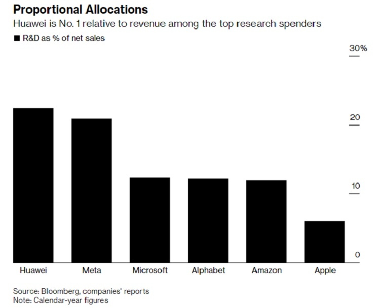 Nos últimos cinco anos, a Huawei quase dobrou seu investimento em P&D, respondendo por 22,4% de sua receita em 2021 – quase o dobro da porcentagem de receita que a Amazon ou Alphabet gastou e mais de três vezes mais que a Apple. Segundo a Bloomberg, apenas a Meta* se permitiu gastar 20,9% de sua receita com fins semelhantes. Os custos crescentes demonstram a determinação da Huawei em sobreviver a todo custo desenvolvendo chips, equipamentos de rede e até smartphones em meio a sanções sem tecnologia dos EUA. As restrições à empresa estão em vigor desde 2019, quando Washington a acusou de colocar em risco a segurança nacional dos EUA. Devido às sanções, a receita da Huawei em 2021 caiu cerca de um terço.