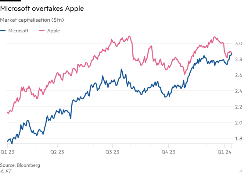 O sucesso do iPhone permitiu à Apple finalmente ultrapassar a Microsoft em valor de mercado em 2010, posição que manteve durante vários anos. A Microsoft manteve brevemente a liderança sobre a Apple em 2020 e 2021 durante a pandemia de COVID-19, graças à sua forte posição na computação em nuvem em meio a um boom no trabalho remoto, enquanto a Apple lutava com a produção do iPhone devido a paralisações de fábrica e problemas de fornecimento. Porém, a cada vez a Apple recuperou o primeiro lugar no ranking das maiores empresas em valor de mercado.