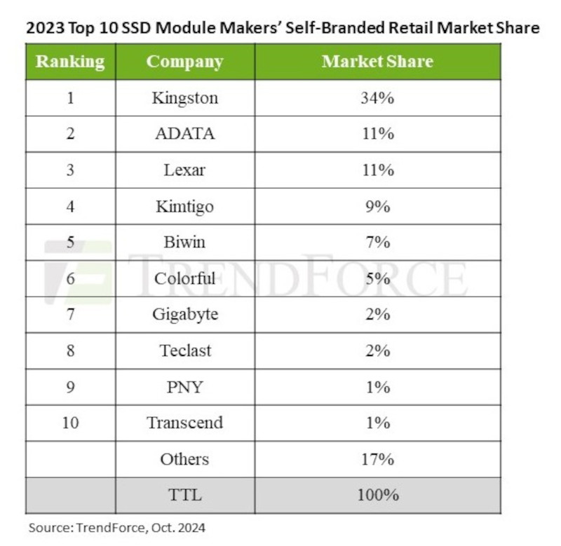 A Kingston manteve sua posição como o maior fabricante de SSD no setor varejista graças à sua extensa rede de distribuição e suporte confiável ao produto. A ADATA ficou em segundo lugar, visando fabricantes de sistemas produtivos e gamers. A Lexar obteve ganhos notáveis no mercado chinês, terminando em terceiro, enquanto a Kimtigo utilizou a sua força local para garantir uma quarta posição no ranking. A marca chinesa de bens de consumo Biwin entrou entre os cinco primeiros pela primeira vez.